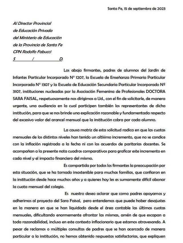 "Un grupo representativo de padres de los 3 niveles del Colegio Sara Faisal ha firmado y presentado en el día de ayer, 18/09/2023, notas dirigidas a la Comisión directiva de la Asociación Femenina de Profesionales 'Dra. Sara Faisal', así como también al Sr. Director de Educación Privada de la Provincia de Santa Fe, CPN Rodolfo Fabucci, y al Sr. Defensor del Pueblo, Jorge Henn. Las mismas tienden a abrir canales de diálogo entre las autoridades del Colegio y los padres, para poder revisar si los montos liquidados se ajustan a la normativa vigente en la materia, se nos brinde información relativa a otros conceptos componentes de cada cuota mensual y tratar de buscar alternativas para poder afrontar estas importantes subas, en caso de que correspondan", informaron mediante un comunicado.