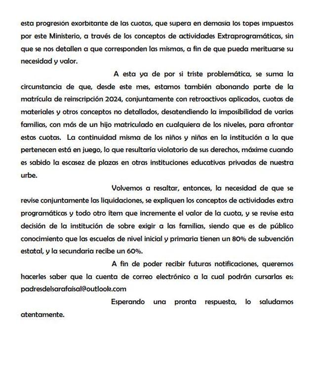 "A esta ya de por si triste problemática, se suma la circunstancia de que, desde este mes, estamos también abonando parte de la matrícula de reinscripción 2024, conjuntamente con retroactivos aplicados, cuotas de materiales y otros conceptos no detallados, desatendiendo la imposibilidad de varias familias, con más de un hijo matriculado en cualquiera de los niveles, para afrontar estas cuotas. La continuidad misma de los niños y niñas en la institución a la que pertenecen está en juego, lo que resultaría violatorio de sus derechos, máxime cuando es sabido la escasez de plazas en otras instituciones educativas privadas de nuestra urbe", observaron.