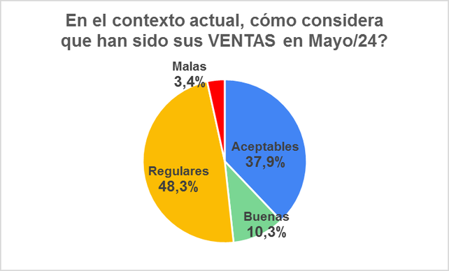 Según el informe, a pesar del efecto distorsivo de los índices de inflación, a la hora de evaluar el desempeño de sus ventas, "los comerciantes no se mostraron tan disconformes, -seguramente considerando el contexto general- y, por eso, calificaron sus ventas como aceptables en un 37,9% y buenas un 10,3% más, algo inferior a lo relevado en el mes de abril".