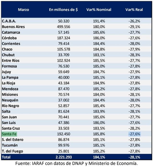 La caída fue para todas las jurisdicciones. Santa Fe recibió 27,6% menos en marzo.