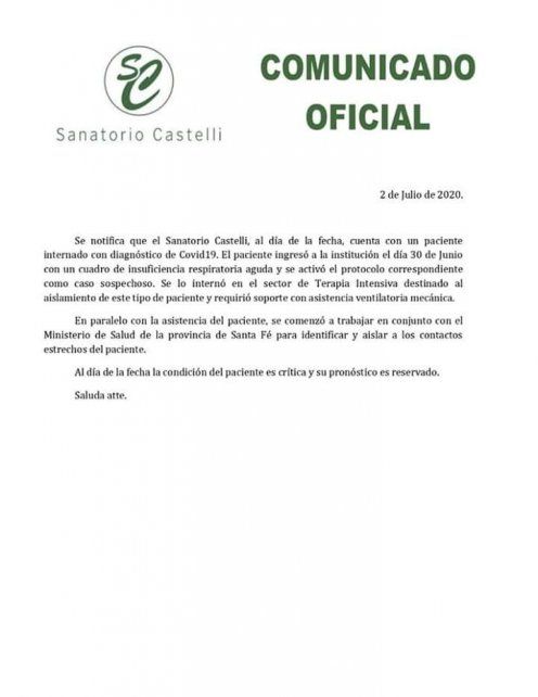 Un comunicado del sanatorio Castelli, el otro gran efector privado de Venado Tuerto, dio cuenta del caso. “El sanatorio Castelli, al día de la fecha, cuenta con un paciente internado con diagnóstico de Covid-19. El paciente ingresó el 30 de junio con un cuadro de insuficiencia respiratoria aguda y se activó el protocolo como caso sospechoso. Se lo internó en el sector de terapia Intensiva destinada al aislamiento de este tipo de pacientes y requirió soporte con asistencia ventilatoria mecánica”.