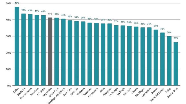 A la hora de presentar la información, Argentinos por la Educación compartió gráficos enriquecedores. Uno de ellos refleja la proporción de aulas en las que se encuentran al menos un estudiante del decil más bajo de cada provincia y uno del decil más alto también del mismo distrito. Los datos fueron recabados en el 2021.