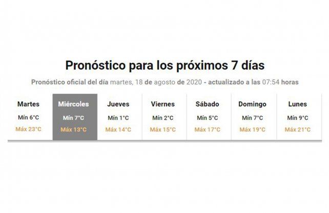 En ese sentido, el SMN prevé para el miércoles una mínima de 7ºC y una máxima de solo 13ºC. El jueves se espera una mínima de 1ºC y una máxima entorno a los 14ºC; con cielo despejado.