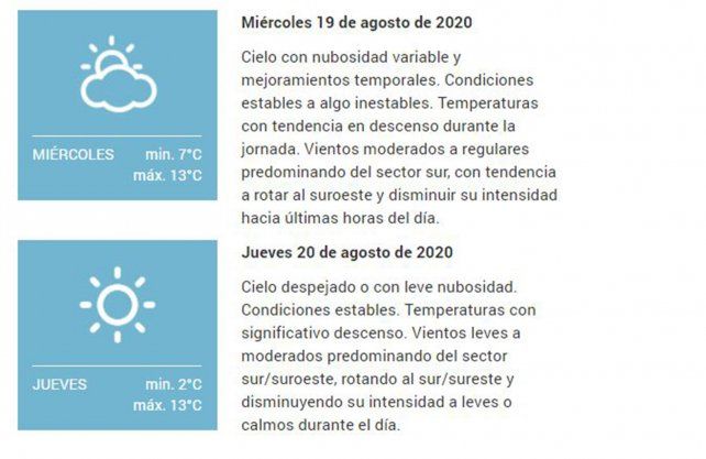 Par el jueves, aticipa: "Cielo despejado o con leve nubosidad. Condiciones estables. Temperaturas con significativo descenso. Vientos leves a moderados predominando del sector sur/suroeste, rotando al sur/sureste y disminuyendo su intensidad a leves o calmos durante el día. Una mínima de 1ºC y una máxima de 15ºC.