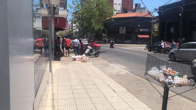 El local, que carece de marquesinas, vidrieras o ventanas visibles, opera con un flujo constante de camiones que estacionan en doble fila para descargar mercadería, contribuyendo al ya complicado tránsito de la ciudad. Pero el verdadero impacto se siente en la vía pública: hasta un centenar de motociclistas y ciclistas deliverys se concentran frente al local, ocupando la vereda y gran parte de la cuadra.