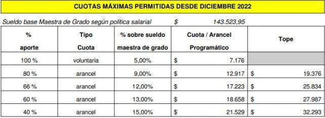 La escala de cuotas vigente desde diciembre de 2022 en los 850 colegios privados de la provincia es: escuelas con 100% de aporte estatal un máximo de $7.176 (arancel voluntario), escuelas con aporte estatal del 80% el tope es de $19.376, las del 66% de aportes $25.834 de tope, 60% de aportes estatales con $27.987 de máximo y aquellos colegios con 40% de aportes del Estado pueden cobrar hasta $32.293 de cuota.