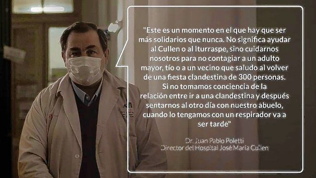 El director del hospital doctor Juan Pablo Poletti fue puntual: "Si no tomamos conciencia de la relación entre ir a una clandestina y después sentarnos al otro día con nuestro abuelo, cuando lo tengamos con un respirador va a ser tarde". En una publicación de "Comunidad Cullen" en Facebook el jefe del Hospital J. M. Cullen se refirió a la creciente aparición de reuniones masivas y pidió "ser más solidarios que nunca".
