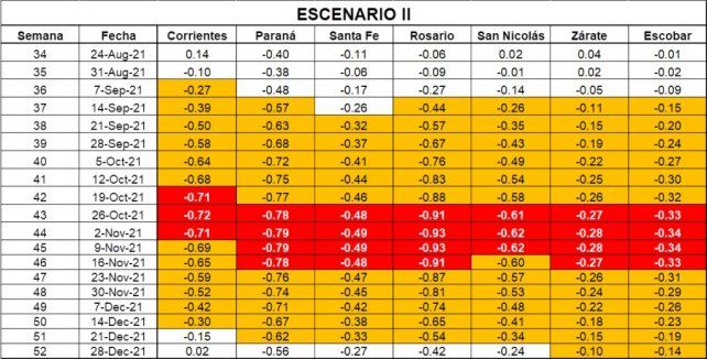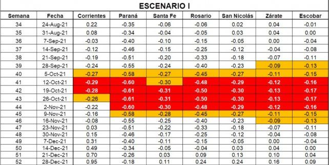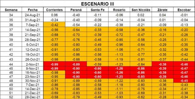 Como muestra el informe del organismo nacional, prevalece una tendencia descendente en todas las secciones del río Paraná en territorio argentino que se mantendrá en los próximos tres meses. Cada escenario que se traza indica una perspectiva posible de menor a mayor gravedad según como evolucione el río. Recién en diciembre se plantea un repunte en el nivel fluvial.