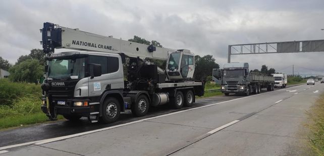 Los camiones de traslado de los componentes del puente Bailey que se montará sobre el Carretero arribaron al campamento que Vialidad Nacional posee en La Guardia, en el cruce de Ruta Nacional 168 y Ruta Provincial 1