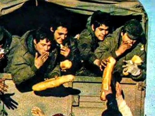 Estaban hambrientos y llegaron ocultados por militares que pretendían que regresen a sus hogares sin que nadie se enterara, ni los viera. La gente, emocionada, logró acercarse a los camiones, extendiendo sus brazos y ofreciendo pan. Cuentan que las panaderías entregaban los canastos repletos de pan para acercarles a los recién llegados.