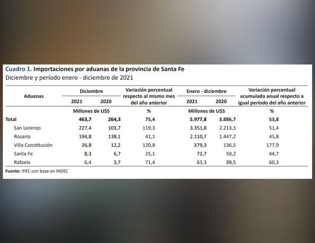 Durante el 2021 la provincia Santa Fe registró importaciones (entre las cinco aduanas que posee) por un monto total de 5.977,8 millones de dólares. Esa cifra, es un 53,8% más que lo importado durante el año anterior. En diciembre del año pasado, las compras al exterior alcanzaron un valor de 463,7 millones de dólares; 75,4% más respecto del mismo mes del 2020