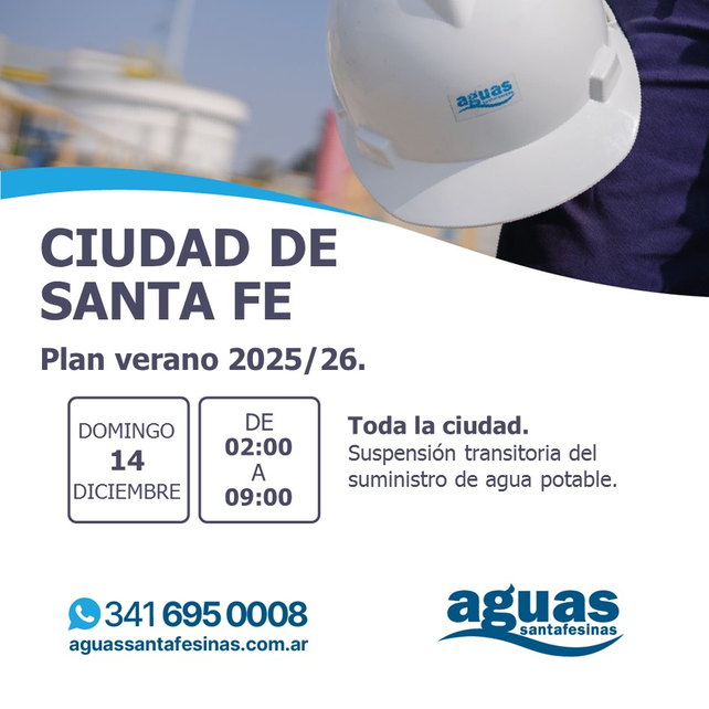Aguas Santafesinas (Assa) informó que este domingo habrá un nuevo corte de agua en toda la ciudad de Santa Fe, en el marco de tareas de mantenimiento en la planta potabilizadora como parte del Plan Verano 2025/26.