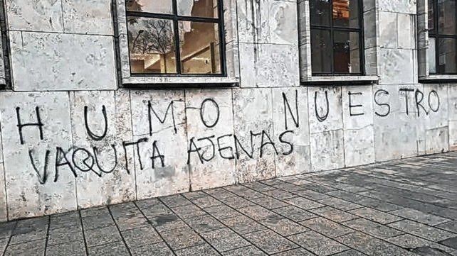 En el caso de la Municipalidad, las pintadas se focalizaron sobre los laterales de la fachada y los pedestales de los leones.