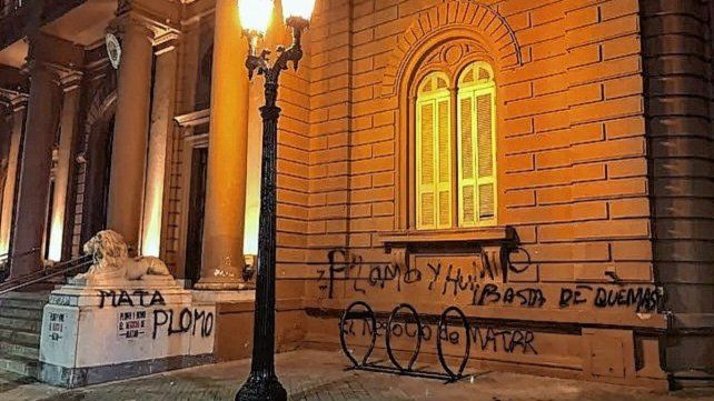 Las fachadas de las sedes de la Gobernación, de la Municipalidad, la Catedral y el edificio de los tribunales provinciales de la ciudad de Rosario fueron vandalizadas con pintadas en las últimas horas. También, la exfuente del Mercado del Patio y en el cartel con el logo de Rosario en el Parque de Colectividades.