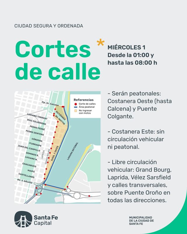 Los cortes de tránsito comenzarán a las 1:00 hs y se extenderán hasta las 8:00 hs en varias intersecciones de la ciudad, afectando principalmente las zonas cercanas a la Costanera Oeste y los boliches. Los desvíos estarán indicados por carteles y personal municipal en el lugar.