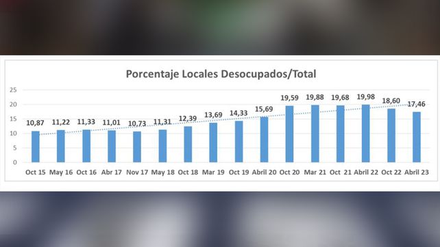 "Relevamos un total de 7.086 locales y de esos, 1.237 están desocupados. El número puede sonar a mucho, pero tenemos que analizar el contexto y tenemos que ver que vamos camino al escenario de prepandemia y alcanzar en algún momento al 10 o 12 por ciento de locales desocupados",. Hoy es del 17,45%.