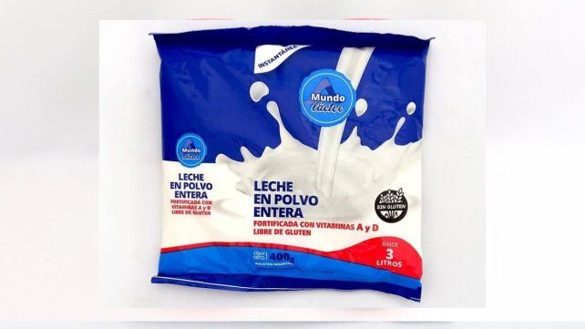 Se identifica como leche en polvo entera fortificada con vitamina A y D Libre de Gluten de la marca Mundo Lácteo, elaborada por el Registro Nacional de Establecimiento N.º 2104-005711, con Registro Nacional de Producto Alimenticio N.º 04-075076, Razón Social CDMCBA SRL.