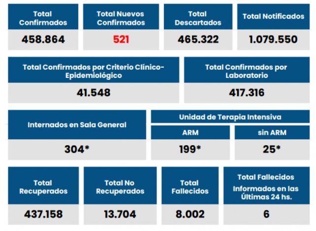 El Ministerio de Salud informó que seis pacientes perdieron la vida y el total ascendió a 8.002 en la provincia