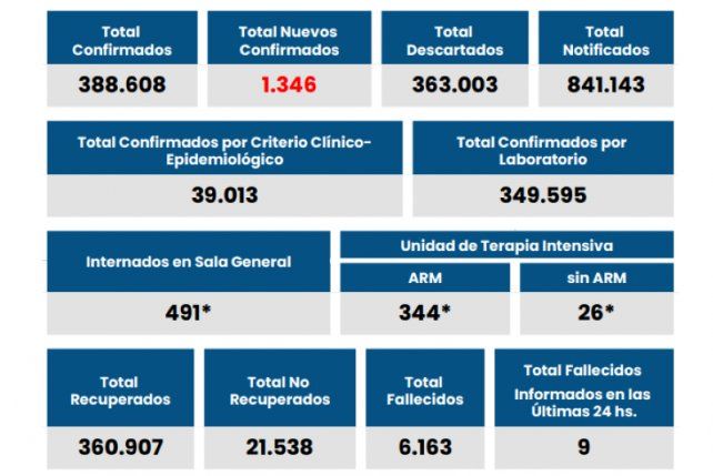 El total de contagios en la provincia se elevó a 388.608 (llegando a un total de 46.921 en la ciudad de Santa Fe) y se mantienen activos 21.538. Hay 491 pacientes internados en camas generales y 370 en terapia intensiva.
