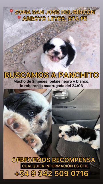 “Macho de dos meses, pelaje negro y blanco. Lo robaron en la madrugada del 24/3”, dice el posteo. Además de ofrecer una recompensa, proporcionan un número de teléfono para comunicar cualquier tipo de información que pueda ayudar a encontrar al cachorro (+5493425090716).
