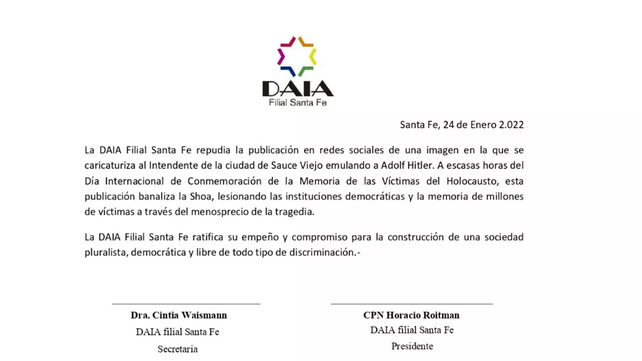Con la firma de su titular, Horacio Roitman, y de su secretaria, Cintia Waismann, el comunicado de la DAIA de Santa Fe ratificó "su empeño y compromiso para la construcción de una sociedad pluralista, democrática y libre de todo tipo de discriminación".