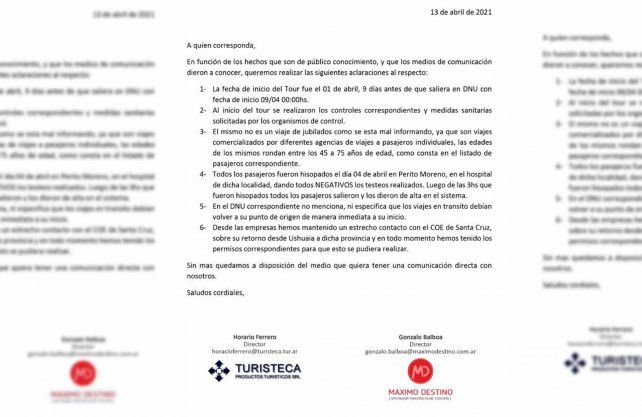 Sin embargo, la empresa emitió un comunicado argumentando que el contingente cumplía con todas las disposiciones sanitarias y protocolares a la fecha en la que se realizó el viaje. La fecha de inicio del tour fue el jueves 1 de abril, nueve días previo a que se decrete el DNU que prohibió los viajes grupales en el país, por lo que la empresa habilitó la salida.