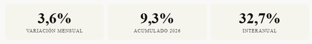 La variación interanual del 32,7% consolida una desaceleración sostenida respecto del pico registrado en 2024, cuando el índice llegó a superar el 296% interanual en marzo de ese año. Sin embargo, la aceleración observada en marzo —tras varios meses de subas más moderadas, con un piso del 1,4% en mayo de 2025— enciende señales de atención sobre la dinámica de precios en el inicio de 2026.