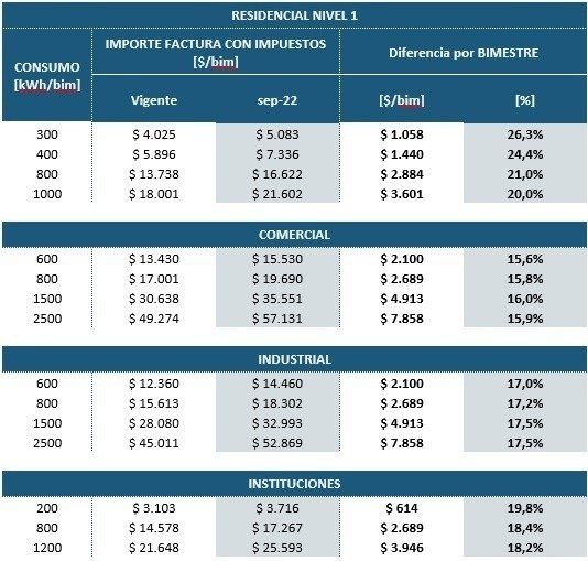Por último, fuentes de la cartera precisaron que para el sector comercial e industrial que se divide en una decena de categorías para usuarios generales, pymes y grandes clientes, se prevé que un usuario de la categoría G1 pasará a pagar $5.486 con la nueva tarifa contra los $4.333 abonados en agosto; en tanto un usuario pyme de la categoría T2 pagará $ 40.425 contra $30.901 de agosto; y un gran usuario de la categoría T3 abonará alrededor de $171.141 con la nueva tarifa contra $127.780 de agosto.
