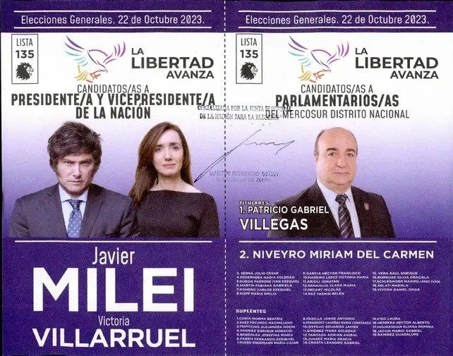 La Libertad Avanza (LLA) postula a Javier Milei y Victoria Villarruel (que sacaron más votos en las Paso) para presidente y vice y a Patricio Villegas en la lista de parlamentarios del Mercosur distrito nacional. Romina Diez, Nicolás Mayoraz y Rocío Bonacci abren la de diputados nacionales y Andrea Calligaris para Parlasur en representación de Santa Fe.