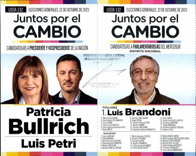 En Juntos por el Cambio (J×C), Patricia Bullrich y Luis Petri componen fórmula presidencial y Luis Brandoni encabeza como Parlamentario del Mercosur nacional. José Núñez, Verónica Razzini y Alejandro Bongiovanni lideran la lista de diputados nacionales y Martín Ponticelli la de Parlamentario por Santa Fe.