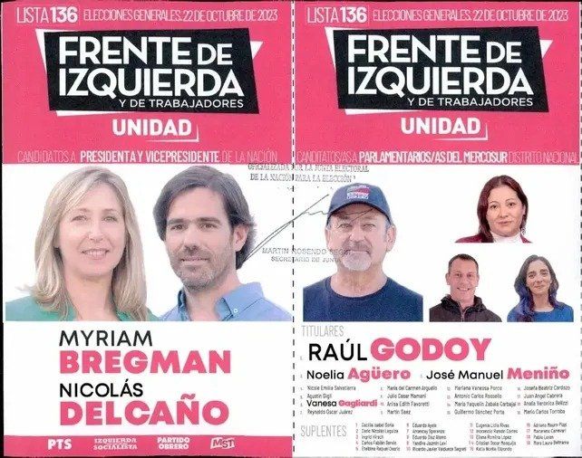 Asimismo, el Frente de Izquierda Unidad (FIT) impulsa a Myriam Bregman y Nicolás del Caño para presidenta y vice y a Raúl Godoy para el Parlasur distrito nacional. Octavio Crivaro, Daniela Vergara y Facundo Fernández abren la lista de diputados nacionales y Fito Columbich va como candidato al Parlasur distrito Santa Fe.