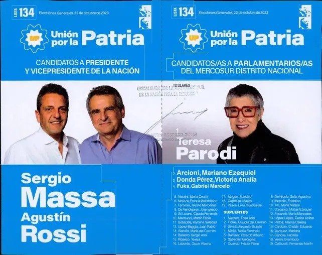 Unión por la Patria (U×P) promueve a Sergio Massa y Agustín Rossi para presidente y vice y a Teresa Parodi para el Parlasur distrito nacional. Germán Martínez, Florencia Carignano y Diego Giuliano abren la lista de diputados nacionales y Ricardo Olivera va por el Parlasur distrito Santa Fe.