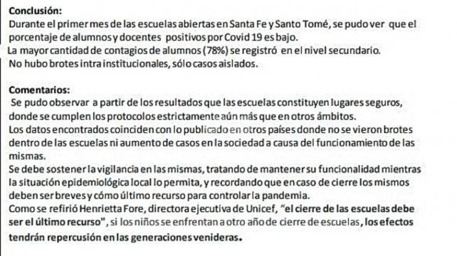 La filial santafesina de la Sociedad Argentina de Pediatría, en colaboración con Padres Organizados, realizó un relevamiento de la situación epidemiológica en las escuelas de Santa Fe y Santo Tomé durante el primer mes de clases presenciales. Según sus conclusiones, “se pudo ver que el porcentaje de alumnos y docentes positivos por Covid 19 es bajo” y que “la mayor cantidad de contagios de alumnos (78%) se registró en el nivel secundario”. Además, “no hubo brotes intrainstitucionales, solo casos aislados”.