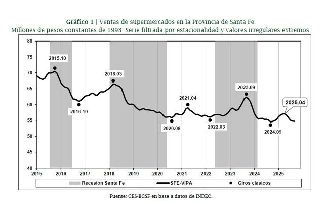 Según el análisis, el comportamiento de las ventas en supermercados acompañó el ciclo económico provincial, aunque con un rezago temporal. Durante la recesión 2022-2024, el consumo en este canal continuó creciendo durante buena parte del período y comenzó a caer recién hacia fines de 2023, en línea con el retroceso más reciente de la actividad económica en Santa Fe.