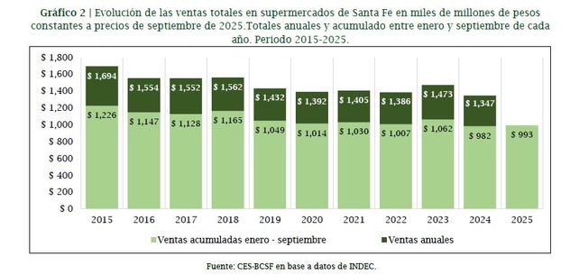 Un informe elaborado por el Centro de Estudios y Servicios de la Bolsa de Comercio de Santa Fe (CES-BCSF), en base a datos de la Encuesta de Supermercados del INDEC revela que las ventas en supermercados de la provincia de Santa Fe muestran una tendencia negativa sostenida en los últimos diez años y que, pese a una leve mejora interanual, 2025 se encamina a cerrar como el segundo peor año del período analizado.