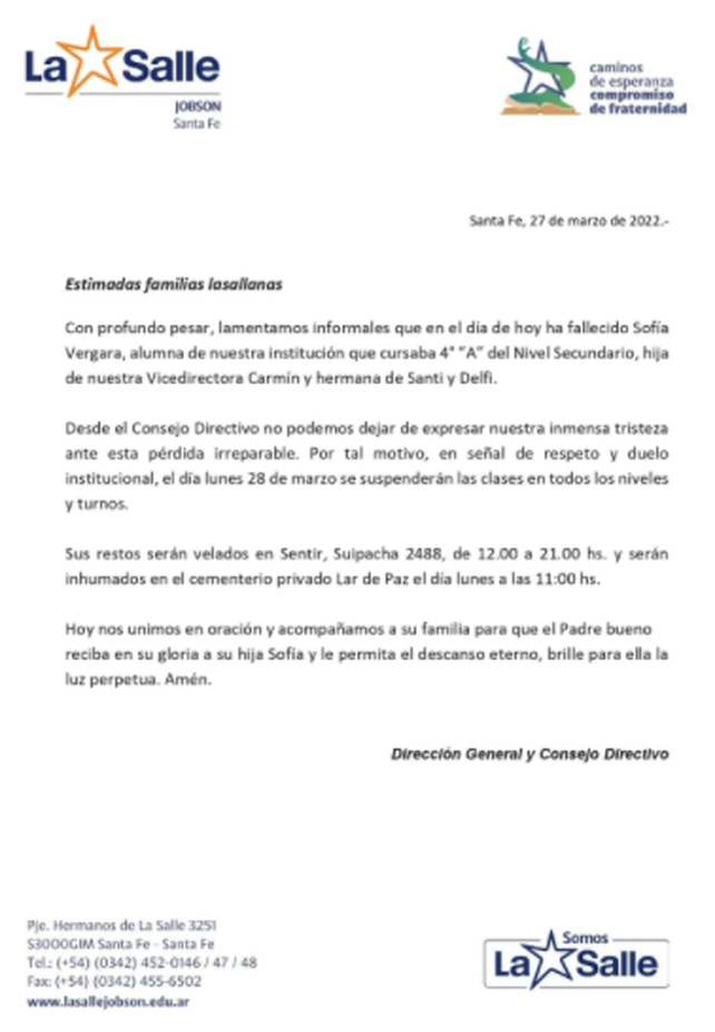 "Desde el Consejo Directivo queremos expresar nuestra inmensa tristeza ante esta pérdida irreparable", describieron desde la institución y agregaron: "Nos unimos en oración y acompañamos a su familia para que el Padre bueno reciba en su gloria a su hija y le permita el descanso eterno, brille para ella la luz perpetua".