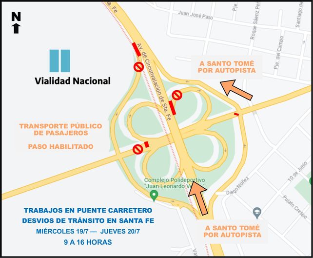 Para el ordenamiento del tránsito Vialidad Nacional convocó a los municipios de Santa Fe y Santo Tomé, la Agencia Provincial de Seguridad Vial y Policía Vial de la Provincia, organismos con los que se diseñó el operativo para respetar la restricción y reducir las demoras por los desvíos. En tal sentido, la circulación se realizará por la Autopista Rosario – Santa Fe, con ingreso y salida de Santa Fe por Circunvalación Oeste. Por el lado Santo Tomé, el flujo de tránsito deberá tomar por Acceso Norte o Ruta Nacional 19, con la alternativa de utilizar el acceso al aeropuerto Sauce Viejo en la zona sur.
