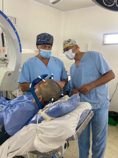 La primera cirugía de Parkinson es un acontecimiento histórico en Santa Fe. Esta operación no convencional comienza fuera del quirófano, en un tomógrafo donde se coloca un halo en la cabeza del paciente. Este dispositivo permite establecer coordenadas precisas para introducir electrodos en los ganglios basales, una región profunda del cerebro. “Es la parte más compleja de la operación”, expresó Márquez, “porque hay que evitar daños a vasos sanguíneos y zonas funcionales”.