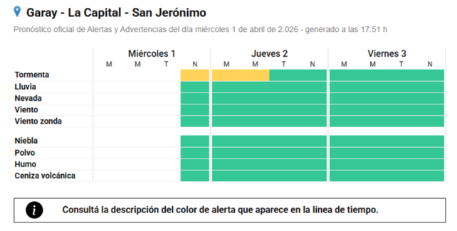 Por su parte, el Servicio Meteorológico Nacional (SMN) emitió un alerta amarillo por tormentas fuertes para Santa Fe que estará vigente desde este miércoles por la noche hasta el jueves por la mañana inclusive. El fin de semana largo arrancará con lluvias intensas antes de un cambio rotundo en las condiciones del tiempo hacia el domingo de Pascua.