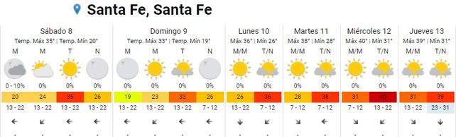 Tanto el SMN como el Centro de Informaciones Meteorológicas (CIM) de la UNL coinciden en su pronóstico extendido anticipando a partir del lunes un ascenso de la temperatura que tocaría su pico durante el miércoles y jueves. Para estas jornadas se espera una mínima de 31 grados y máximas de 40. En tanto, no se esperan precipitaciones para los próximos días en Santa Fe.