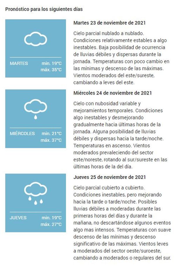 El organismo había anticipado una máxima para este lunes de 40 °C. Pronostica para este martes "cielo parcial nublado a nublado. Condiciones relativamente estables a algo inestables. Baja posibilidad de ocurrencia de lluvias débiles y dispersas durante la jornada. Temperaturas con poco cambio en las mínimas y descenso de las máximas. Vientos moderados del este/sureste, cambiando a leves del este". El calor permanecerá, a pesar de las nubes con una mínima estimada en 19 °C y una máxima de 35 °C.