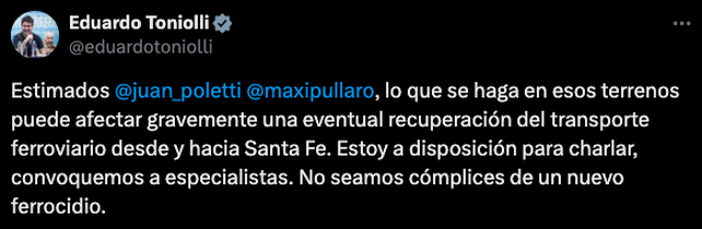 "Estimados @juan_poletti @maxipullaro, lo que se haga en esos terrenos puede afectar gravemente una eventual recuperación del transporte ferroviario desde y hacia Santa Fe. Estoy a disposición para charlar, convoquemos a especialistas. No seamos cómplices de un nuevo ferrocidio", señaló.