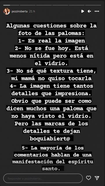"Le tome fotos y comencé a distribuirla entre conocidos y muchos me dijeron lo mismo, ¡es el Espíritu Santo! Es una señal, aunque la verdad no sé qué pensar, pero igualmente nos sacudió tener la imagen en la ventana. Aún esté marcada en la ventana, no tan clara como el día anterior pero sigue allí", cerró.