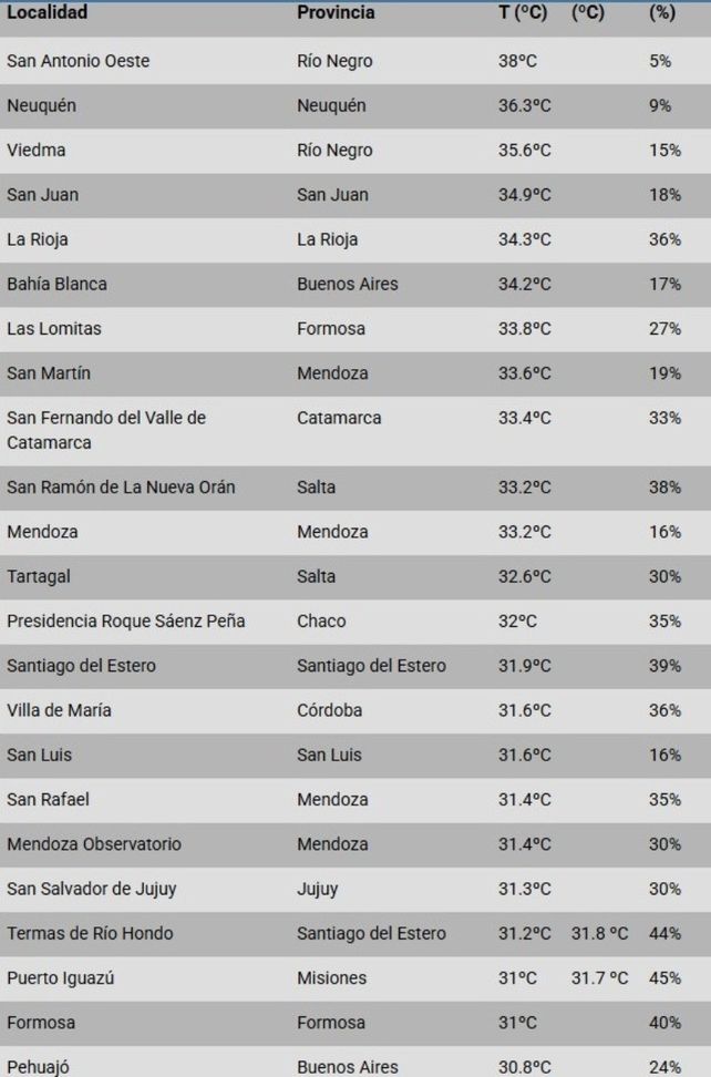 Tales eran los casos de San Antonio Oeste (Río Negro, 38°C), Neuquén (Neuquén, 36,3°) y Viedma (Río Negro, 35,6°), que integraban el podio. Las seguían San Juan (San Juan, 34,9°), La Rioja (La Rioja, 34,3°) y Bahía Blanca (Buenos Aires, 34,2°) y recién después aparecía la primera ciudad del norte: Las Lomitas (Formosa, 33,8°).