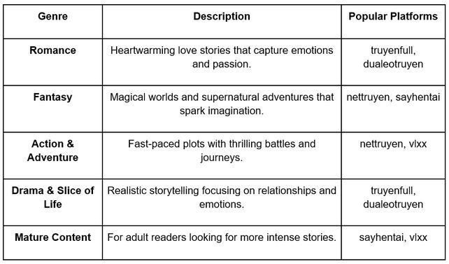 Web platforms like nettruyen and dualeotruyen frequently update new chapters and stories, so readers never miss out on fresh content.