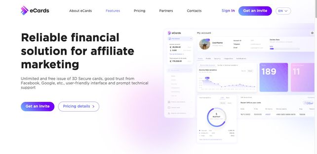 eCards está orientado a equipos con grandes volúmenes de tráfico, ofreciendo condiciones personalizadas de gasto y cashback. Tarjetas virtuales con 9 BINs en Reino Unido y Estonia, aptas para Facebook Ads, Google Ads y otras redes. Cashback estándar: 0,5% en gastos publicitarios; para gasto $250,000 — 1%, reduciendo el costo final del tráfico.
