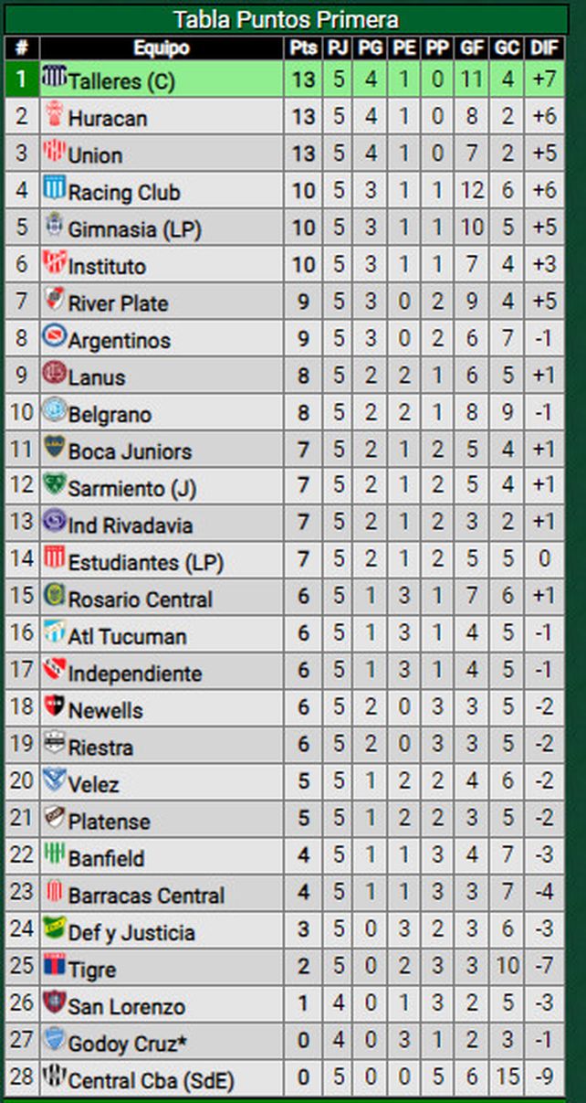 Unión arrancó con todo su participación en el Torneo de la Liga Profesional, ya que tras la quinta fecha quedó como líder junto a Talleres de Córdoba y Huracán, afirmado en zona de copas y lejos de los puestos de descenso.