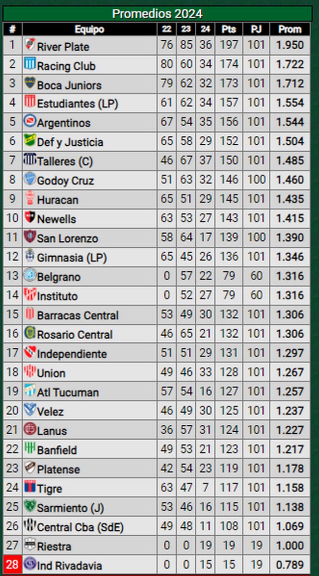 Vale recordar que en la lucha por ingresar a las copas luego habrá que sacarle al campeón del Torneo de la Liga, al del ganador de la Copa Argentina, que liberará cupo si está entre los clasificados por tabla anual, y si algún argentino consigue la Libertadores y Sudamericana, y que estén también ocupando puestos para llegar a los torneos internacionales 2025.