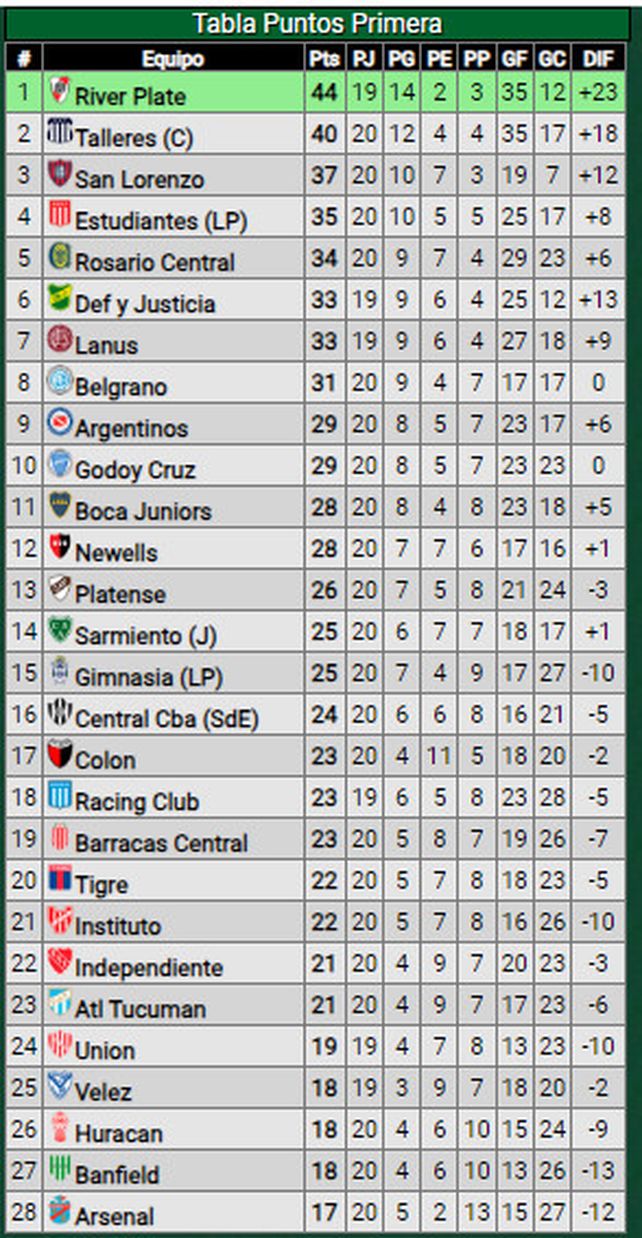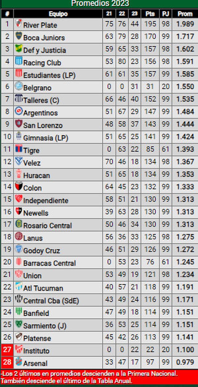 Central Córdoba, que empató ante San Lorenzo, se mantiene cinco puntos por encima de la línea de Unión en la de posiciones de la Liga Profesional, mientras que en el descenso se mantiene a cinco. Banfield, que perdió ante River, quedó un punto por debajo del Tate en la acumulada y siete más abajo en la de promedios.