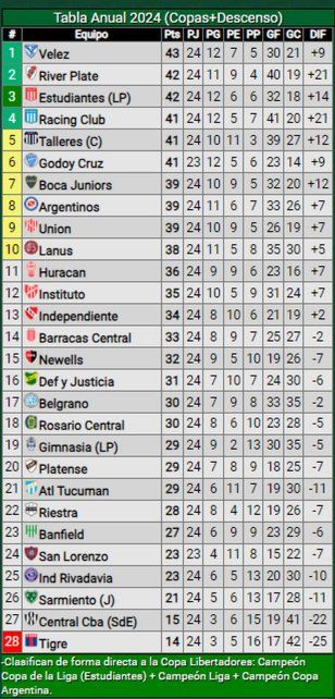 Ya clasificado a la Libertadores por haber sido campeón de la Copa de la Liga Profesional se encuentra Estudiantes (42 puntos). También tiene 42 River (le lleva tres puntos a Unión) y Vélez ostenta 43 y es el líder de la acumulada (le lleva cuatro a los de Kily González).